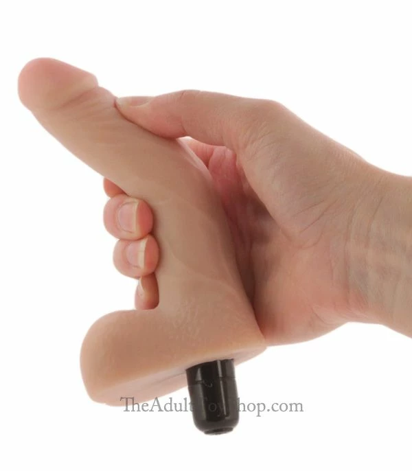 The life like detailing starts at the tapered circumcised head, after the little mushroom tip veins snake their way through the shaft. At the bottom, the cutest round pair of testicles proves the user with a perfect handle to maneuver with, and also lets it stand upright (when the vibrator is removed from the hole, of course).