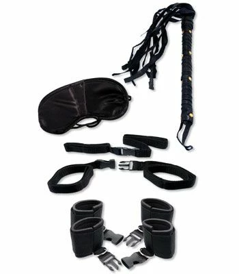 A complete bondage kit. Includes 2 sets of cuffs, 4 tethers, a 2 foot long whip and a blindfold. Unleash your wildest fantasies tonight! This kit says “beginners” but is suitable for all levels of bondage enthusiasts. The kit includes 2 wrist cuffs and 2 ankle cuffs, 4 tethers, a leather whip and a blindfold. The wrist and ankle cuffs are padded for added comfort and attach to the tethers by wide nylon straps. These straps can be tied anywhere, like your bed posts, a chair, the refrigerator door etc. The leather whip measures 2 feet long, and features dangling leather tassels. Perfect for a rough lashing or a light teasing. You also get a satin blindfold which will help keep your partner unknowing about what is coming up next! Indulge in all of your wildest fantasies with this bondage restraint kit!