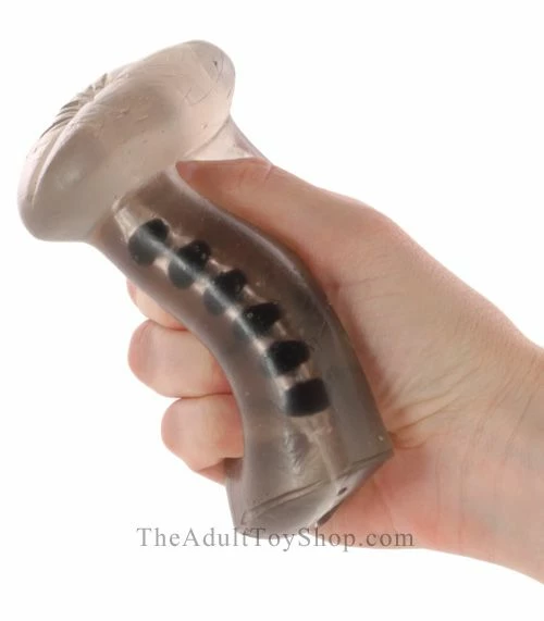 The beads are encased inside their own tunnel so they never directly contact or chafe your erection. They jiggle inside their own tunnel as you stroke and add erotic rolling pressure. The sensation is simply astounding, our male testers really loved this design. The entry has light anal detail and a thick face that feels cushy as it rubs up against your groin. The exit hole at the back allows for easy cleanup.