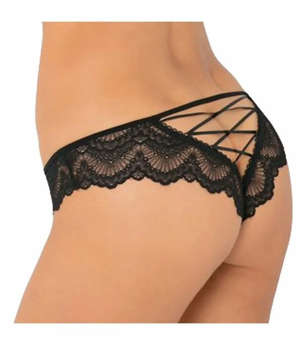 Come Undone Crotchless Panty Black S/M from Rene Rofe Lingerie. Lover, you always make me come undone. Abandon your inhibitions and lose control in this sexy crisscross back lace crotchless panty. Perfect for wild or romantic fun. This sexy 4” ultra-low rise black panty features a sheer textured lace, a scalloped trim, an open crotch, an open back panel with criss-cross detailing, and a cheeky cut back. Fabric content 90% Nylon, 10% Spandex.