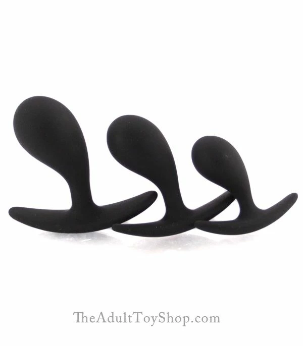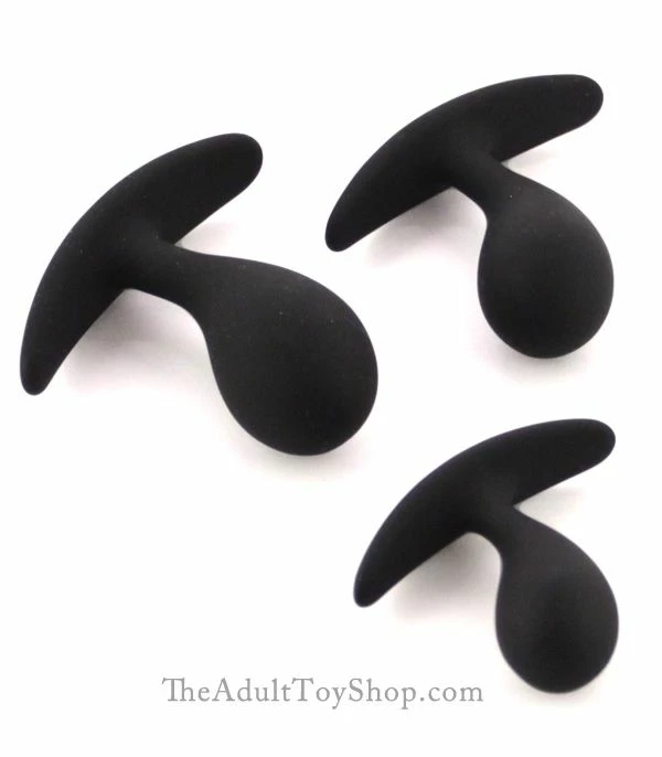 The small size is one of the tiniest prostate plugs we’ve ever seen. Even the largest size is still tame, certainly not too big so even a beginner can actually upgrade to the largest one in the set without stretching the anus too much. It’s perfect for the average guy who simply wants more prostate pleasure. Includes all 3 curved elegant smooth premium silicone plugs as shown. The firm plug sits over top of a flexible neck and bendable base.