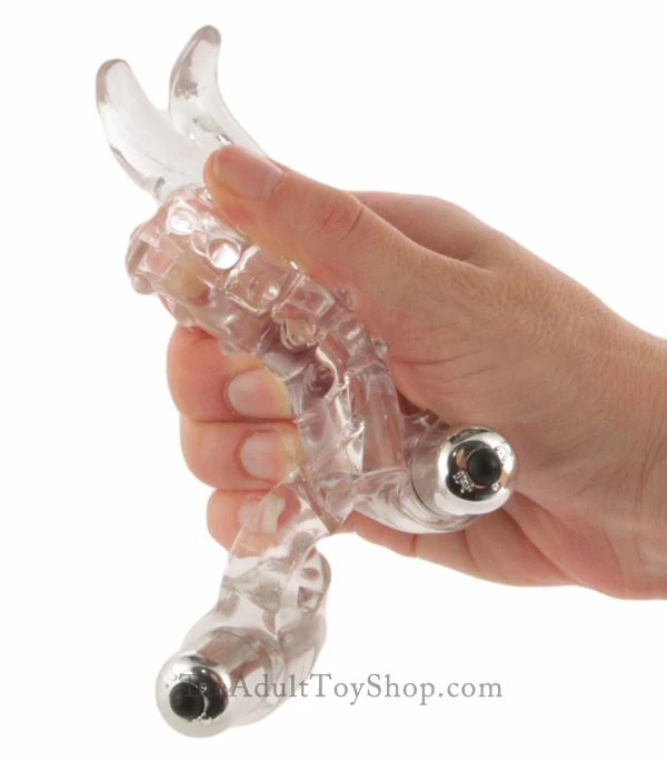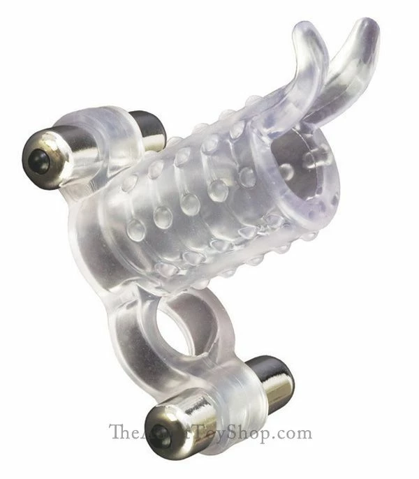 At the opposite end of the sleeve is another holder with a second bullet vibrator to stimulate the partner during intercourse. At the top of the open sleeve are two long flexible prongs that add extra texture during thrusting as they sway up & down in rhythm with the motion of sex. Both partners will enjoy this sensation simultaneously.