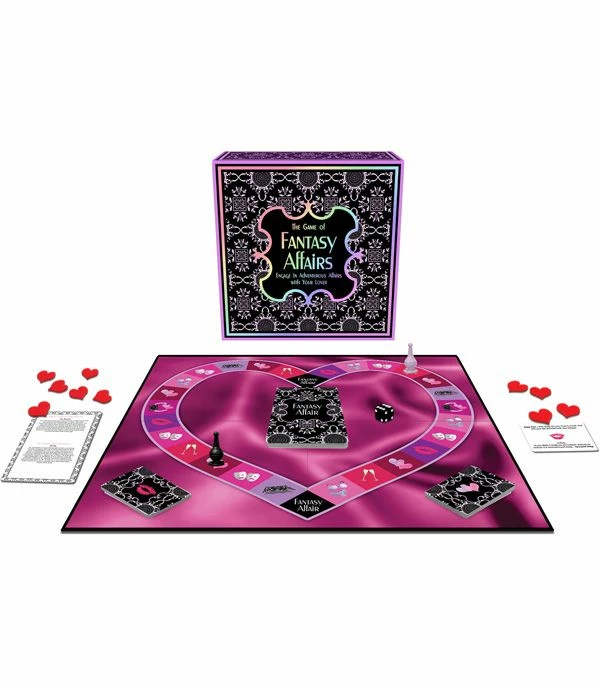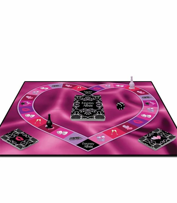 Upon winning, act out the two Fantasy Affair cards that were drawn at the beginning of the game. There are many possibilities within, for example, the “kiss” square has 36 different cards with activities, so it is rare to repeat a task. Includes one 17 inch game board, 36 Fantasy Affair cards, 36 Creative Kiss cards, 104 Heart cards, 10 Heart tokens, 2 game markers, and a dice.