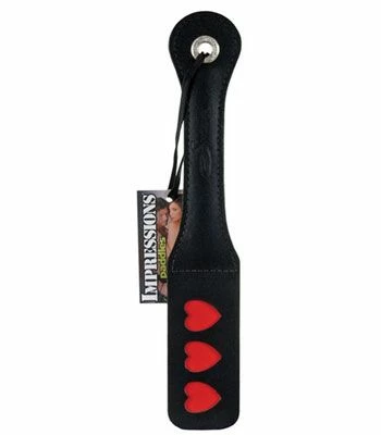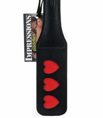 Super stylish tanned leather paddle with sewn in hearts to remind you of the forbidden love. Leather surface with inset hearts remind you of the joys of forbidden love. A loud spanking, slapping sound will fill the room while in your kinky play. Spank hard enough and you just may see a row of hearts welt into the skin on the backside!