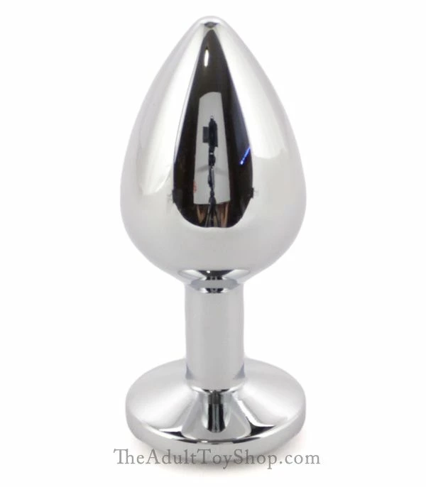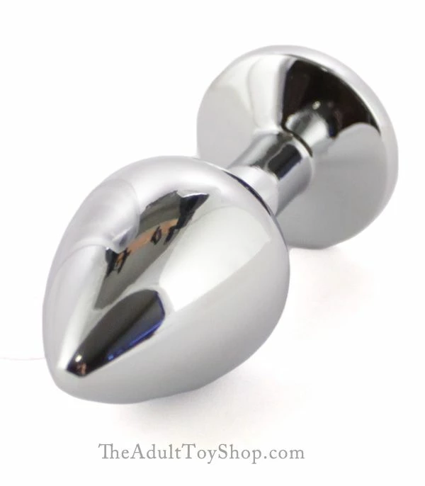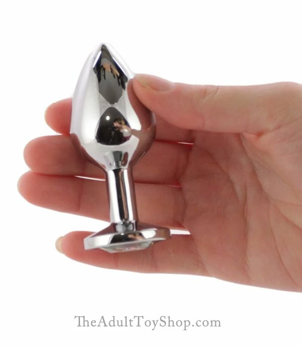 Slick, smooth and solid stainless steel metal is a real delight, it’s very heavy and substantial despite the diminutive size. (Even the large size isn’t overly massive, we’d call it more “upper intermediate”.) The Jeweled Butt Plug is available for sale in 3 sizes, each sold separately. Product measurements are listed below. This product has been featured in our diamond butt plug review.