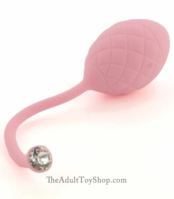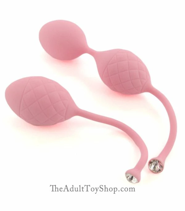 This set includes both duotone balls. A single ball and a dual ball with flexible connector strand in the middle to help them stack comfortably inside the vagina. The inlaid pillow shape silicone looks super stylish. At the end of the flexible retrieval strand is an inlaid Swaivoski crystal for an elegant touch of class.