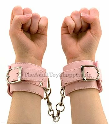 Perfect for any girlie-girl, these super cute pink hand cuffs are lined with plush material for extra comfort! Extremely comfortable, the cuffs feature plush lining to help eliminate the painful pulling you get from non-lined cuffs. The belt style closures allow you to adjust the cuffs. Each cuff features a D-ring and there is a metal clip with 6 inch long chain to keep them together.