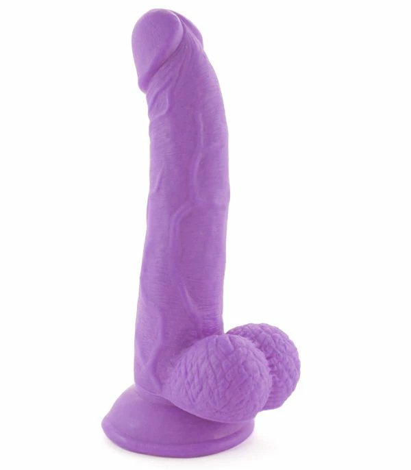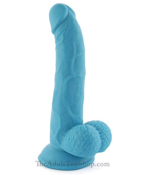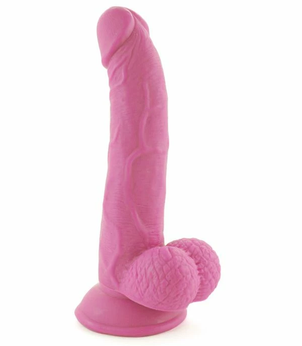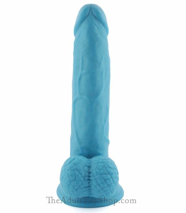 The medium sized curved penis shaft is nicely textured with veins and creases to add a realistic phallic appearance, but you’ll notice the texture as it glides adding a kinky sensual edge to your experience. The smooth penis shaped head has a well cut mushroom tip and the balls at the base are heavily dimpled with a fun cartoon like appearance.