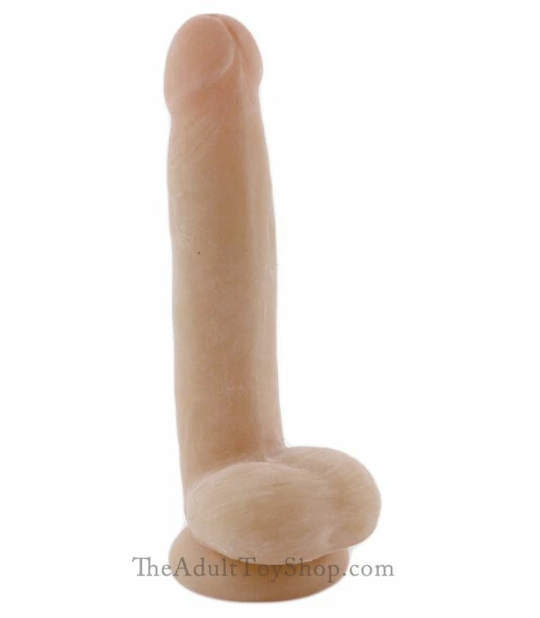 The small rounded head has a slight indent to imitate the foreskin cut of a man’s circumcised penis. The shaft is steady and smooth all the way from top to bottom. The base features a set of flattened testicles that happen to make an excellent cushion to sit on! A little suction cup completes the package below, but we find it’s not as sticky as others because the circumference is so small.