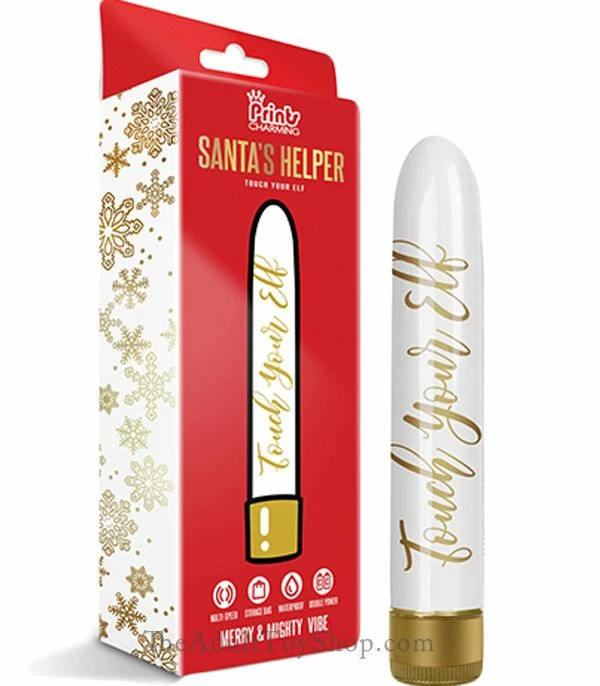 Does your lover have a good sense of humor? This cheeky and super cute Santa’s Helper Christmas vibrator is a fantastic erotic yet playful gift idea. The words “Touch Your Elf” are scripted in gold over the white seamless vibrator in a fancy and classy cursive font. The big plastic vibrator is solid and smooth with a nicely rounded tip.