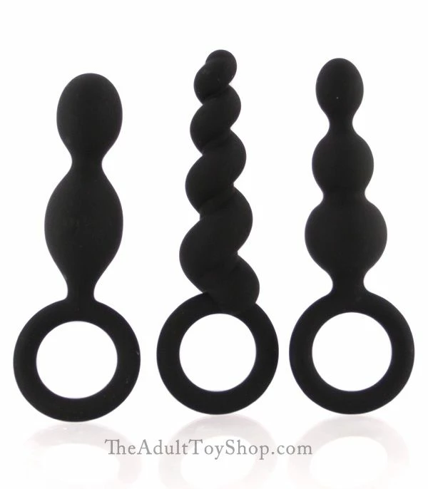 They are all similarly sized, we’d call them “intermediate” sizes. Maybe a bit too much for a real beginner, but if you’ve tried a small butt plug before, this medium sized silicone trio is a perfect upgrade to try something new. Includes a fancy Satisfyer branded storage box with magnetic cover.