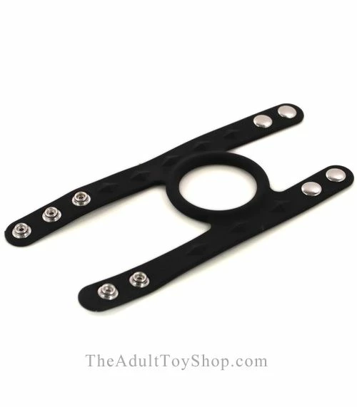 First, place the ring around the penis shaft. Next, wrap one of the straps around the testicles and the other strap around the penis and the back of the scrotum together. Connect the straps with the metal snaps to your desired tightness. This adds perfect pressure to enhance sex and masturbation – plus it looks great too!