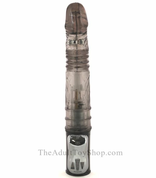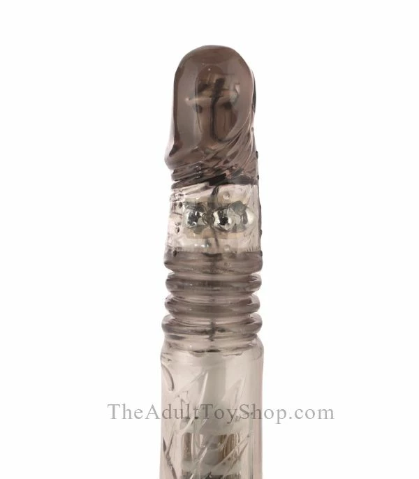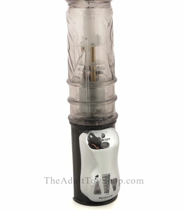 Just under the head a single row of large beads twirls while the accordion shaped neck extends and retracts. The smoky gray silicone is transparent so you can see the thrusting motor working inside which is neat to see.